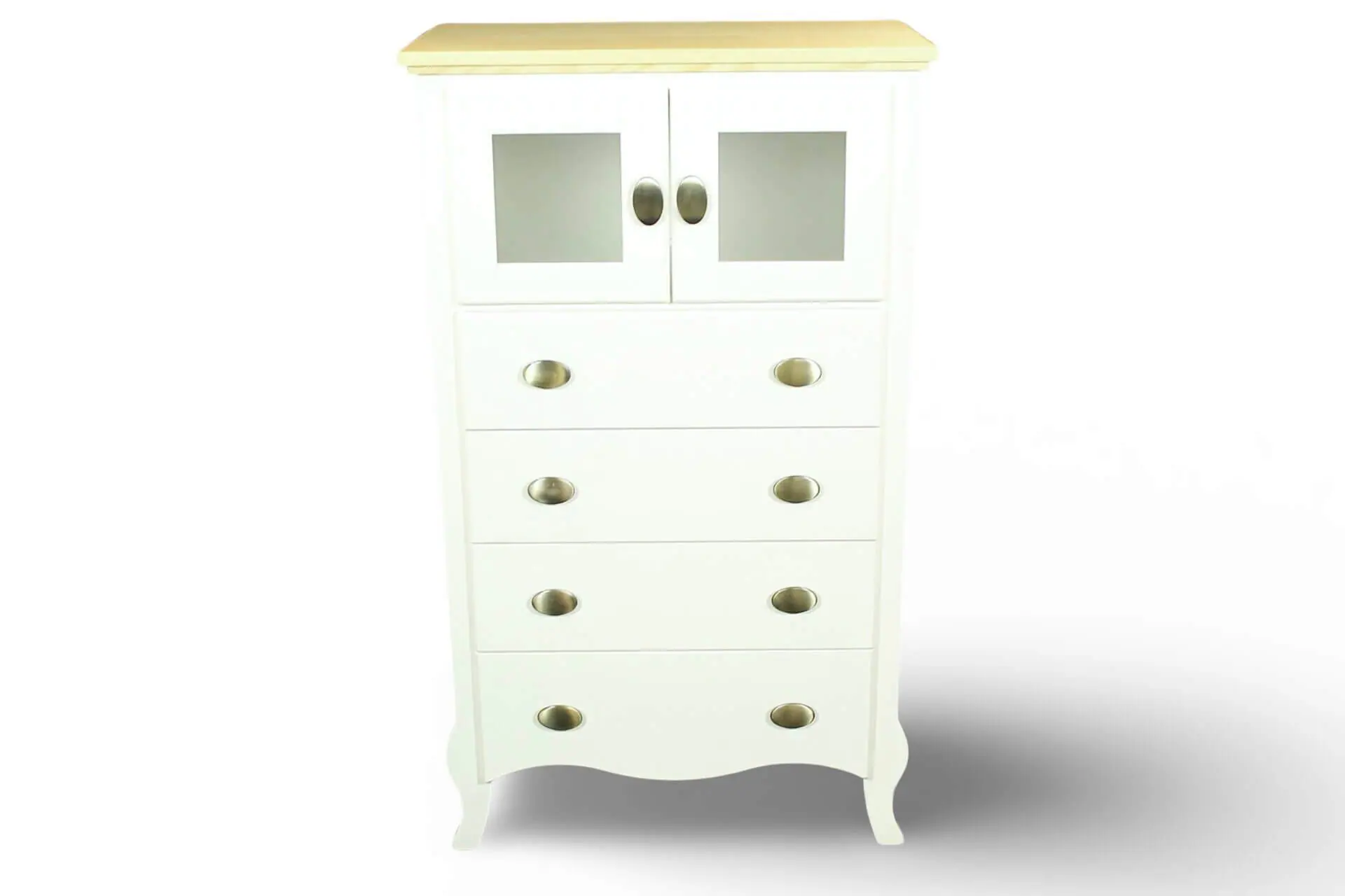 Esta elegante cajonera alta combina un estilo vintage con funcionalidad moderna, ideal para mantener tus pertenencias organizadas con clase. Sus puertas de vidrio en la parte superior añaden un toque sofisticado, permitiendo exhibir artículos decorativos o guardar objetos delicados.